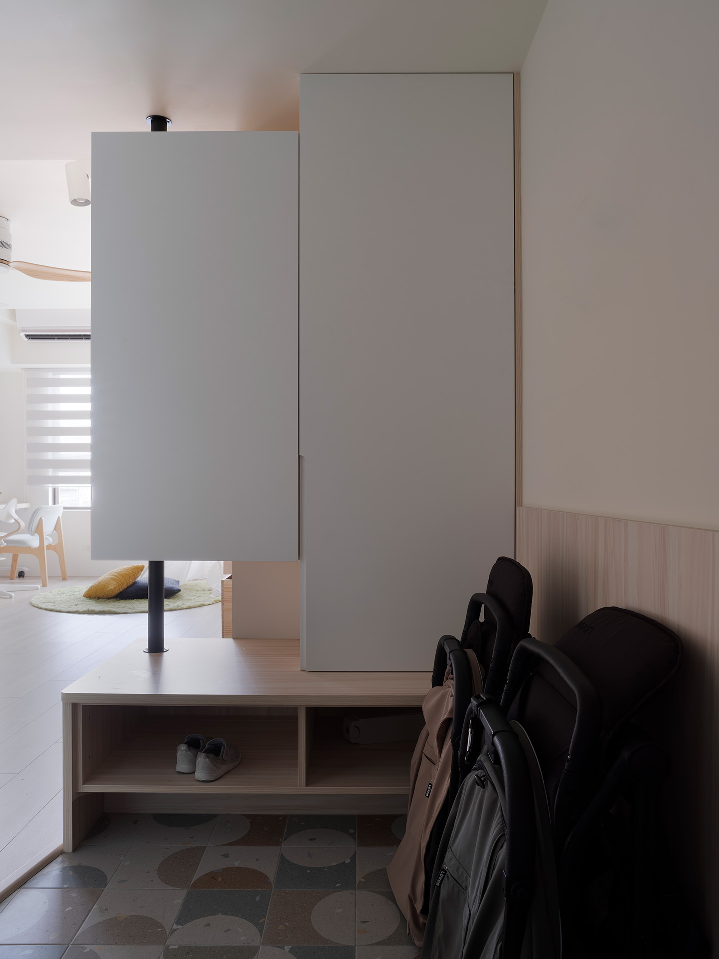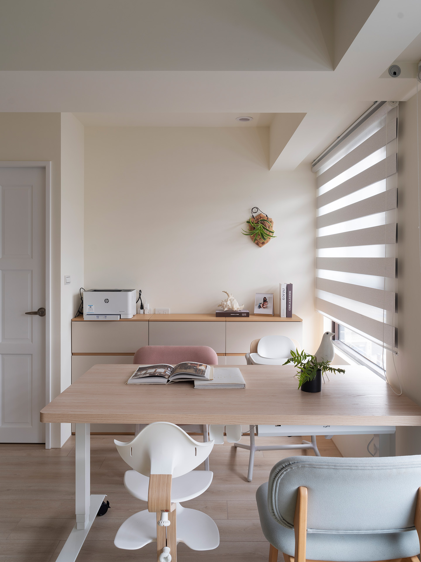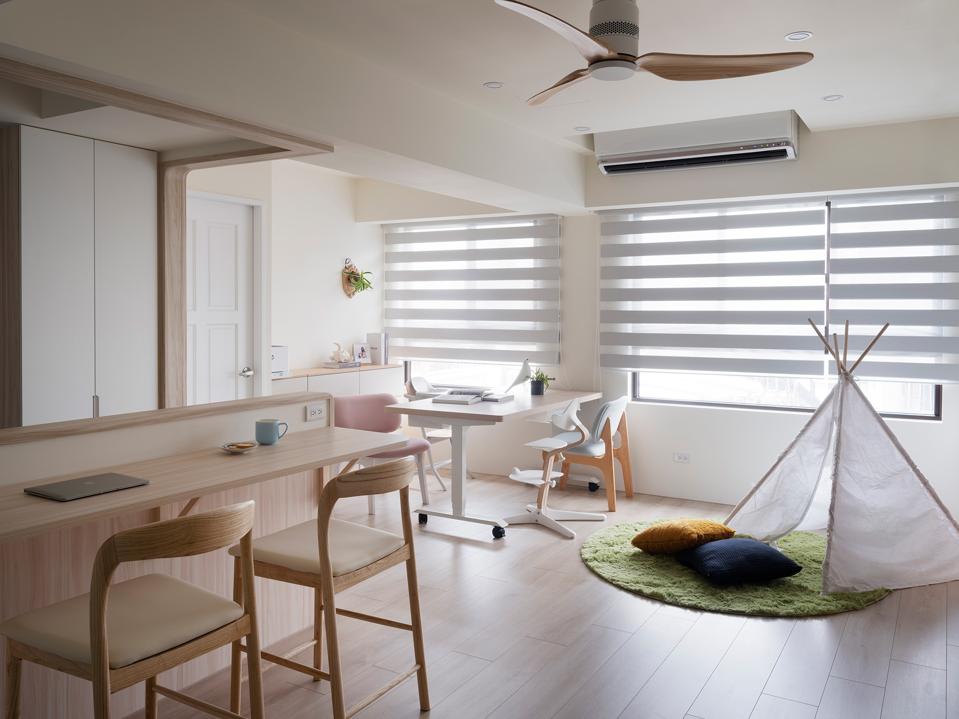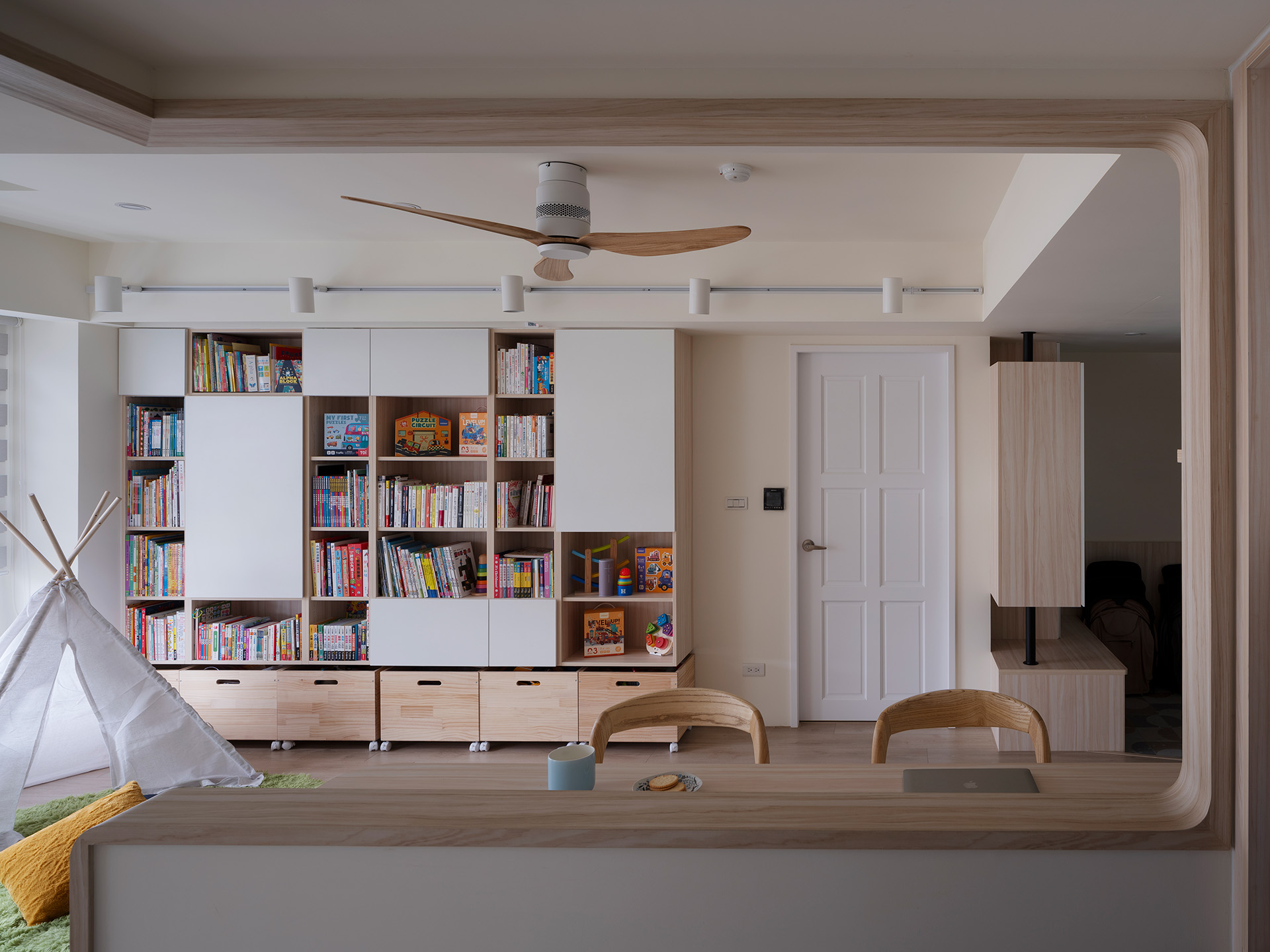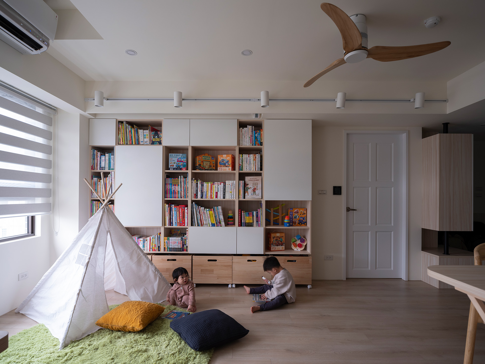 延續「迎芽」的生活習慣,這次我們依舊將客廳電視退居後位,打造出以親子圖書遊樂為主公共空間,明亮、舒適、寬敞的育兒環境,讓孩子們可以盡情地蹦跳奔跑。以海量收納的造型書牆取代電視牆,預留投影機與投影布幕設備的擴充,即使未來有視聽需求依然可以滿足,帶有滾輪的活動實木玩具箱,讓孩子們可以自主應用,學習收納與歸位。