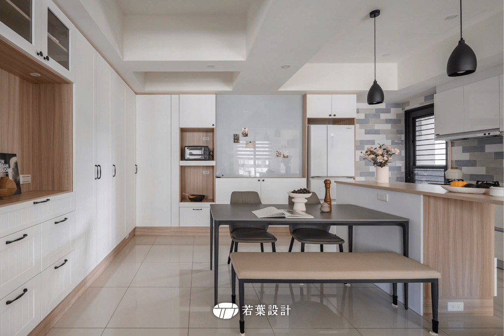 平時不常開伙下廚,偶爾會邀請三五好友到家中聚餐同樂,少了日常下廚產生油煙的狀況,我們在客變階段經建商同意取消廚房的隔間,配合既有廚具來規劃中島餐廳區,將餐廚空間整合為一,並且設置足夠的電器餐櫃與專用迴路,好滿足烹飪電器的設置與擴充。